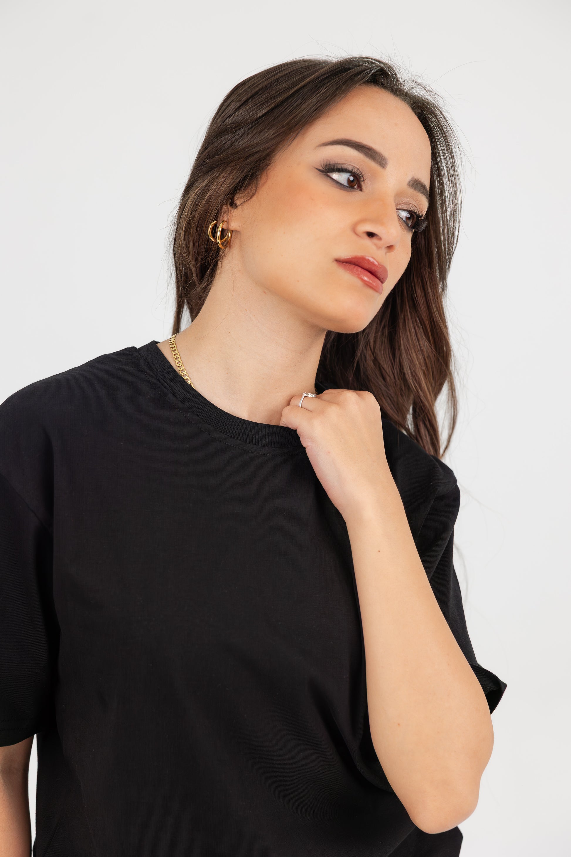قطعة أساسية في دولابك! التيشيرت الأوفر سايز ده معمول علشان الراحة اليومية والإطلالة السريعة السهلة. خامته ناعمة ومريحة على الجسم، وممكن تنسيقيه على جينز، أو تلبسيه لوحده أو تعملي منه لوك كاجوال أو ستايلش — انتي اللي بتحددي!
