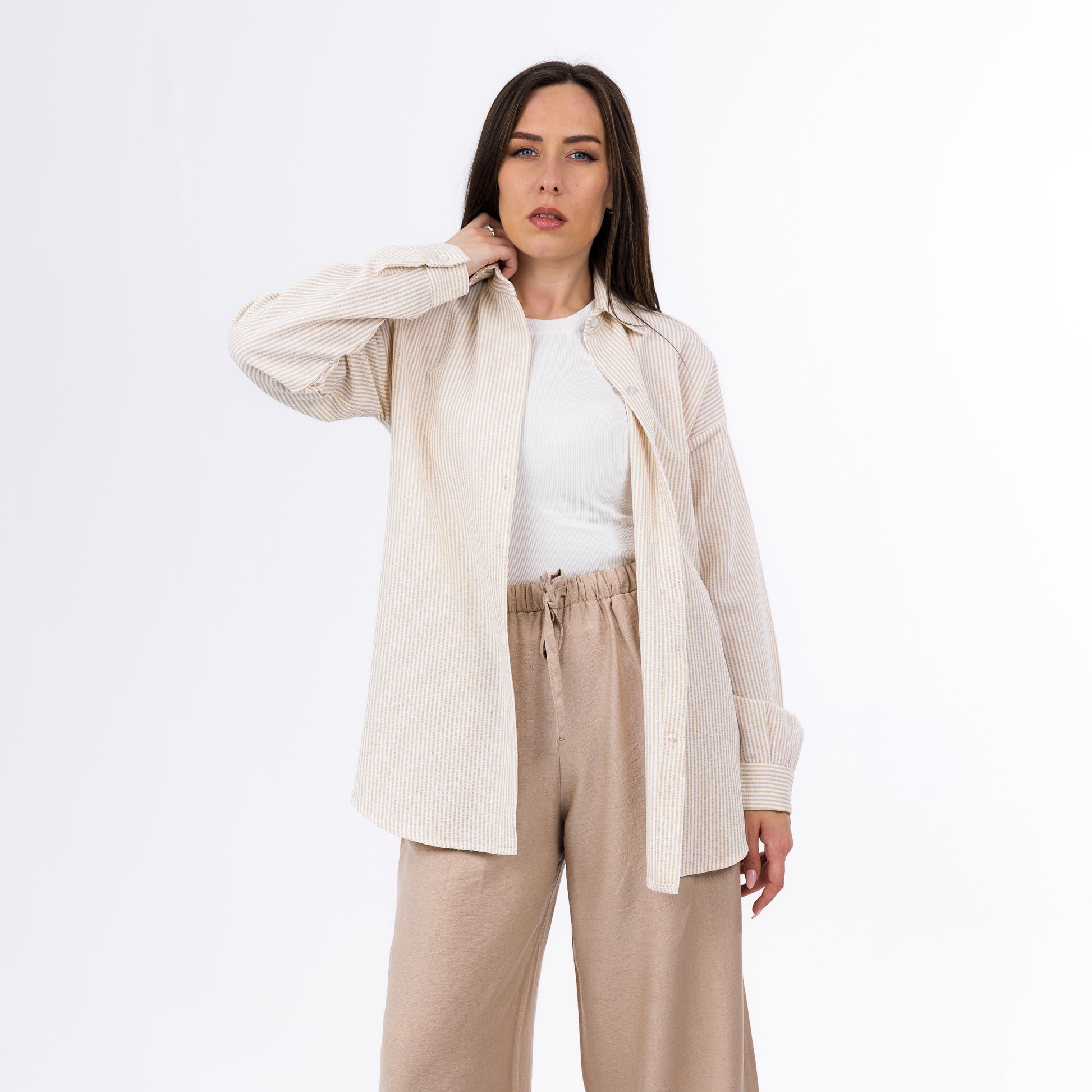 Introducing the Striped Neutral Shirt – where elegance meets everyday comfort. This piece is thoughtfully designed for women who value style, movement, and ease. Crafted with attention to detail, it flatters every body type and adapts effortlessly from daywear to evening looks. Whether you're heading to brunch, the beach, or a laid-back dinner, this versatile piece delivers a chic and effortless aesthetic.